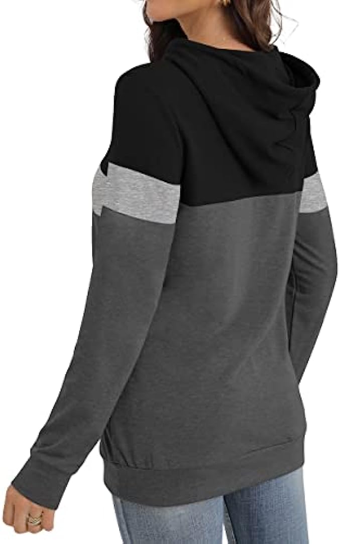 PrinStory Womens Hoodies Pullover Sweatshirts Tunic Top Color Block Long Sleeve Fall Drawstring Tops With Pocket